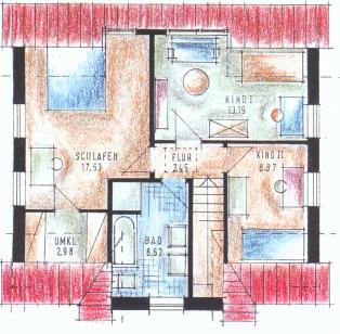 Dachgeschoß in qm: Schlafen: 17,53 - Kind 1: 13,19 - Kind 2: 8,87 Bad: 8,62 - Flur: 2,45 - Umkl.: 2,98